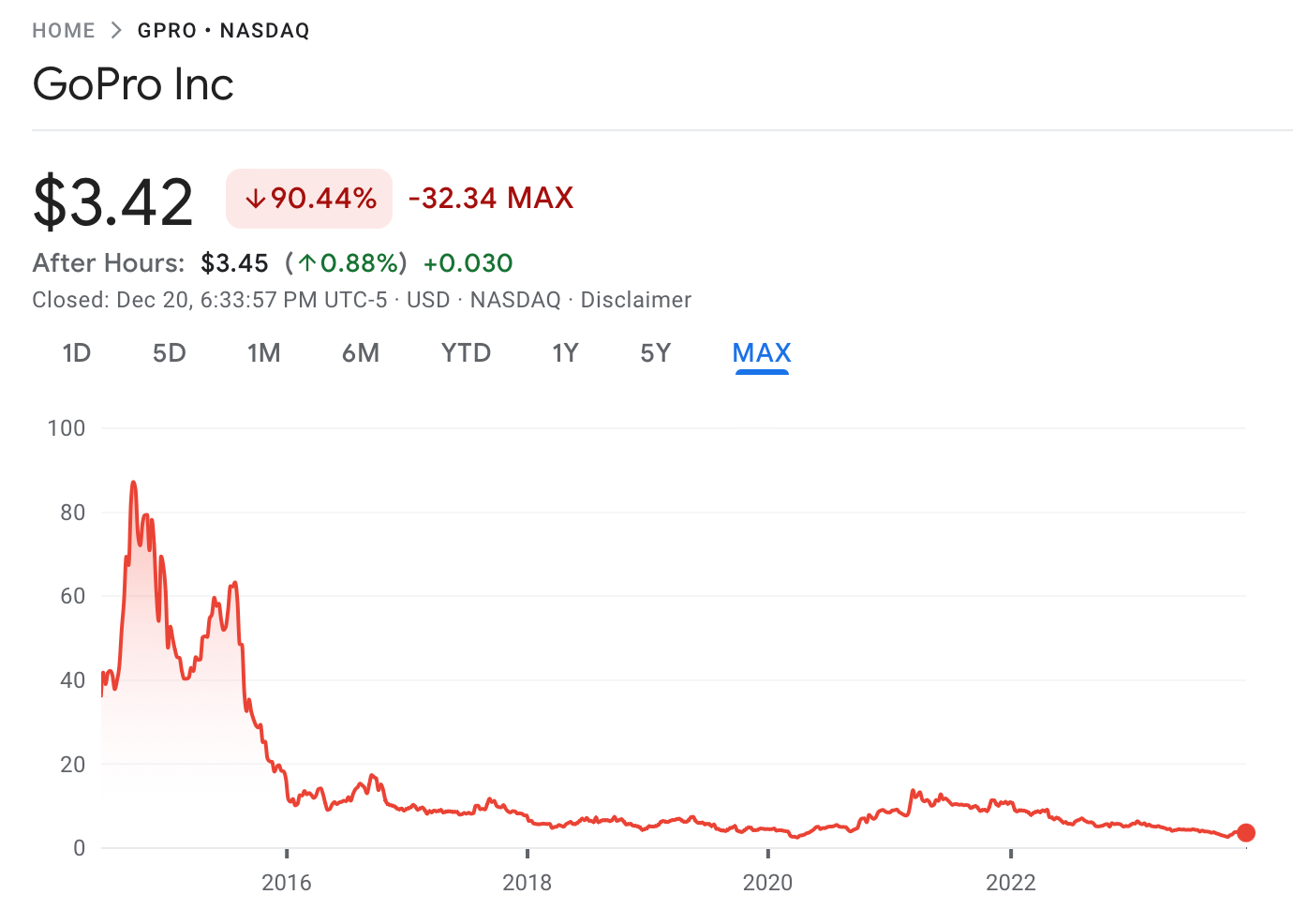 In the 2010s, GoPro dominated the camera market, which giants like Sony and Canon dominated. GoPro cameras, known for their ruggedness and ability to capture high-action footage, filled a niche that traditional cameras or smartphones couldn't. This innovation led to rapid growth and widespread popularity, setting GoPro apart as a market leader.