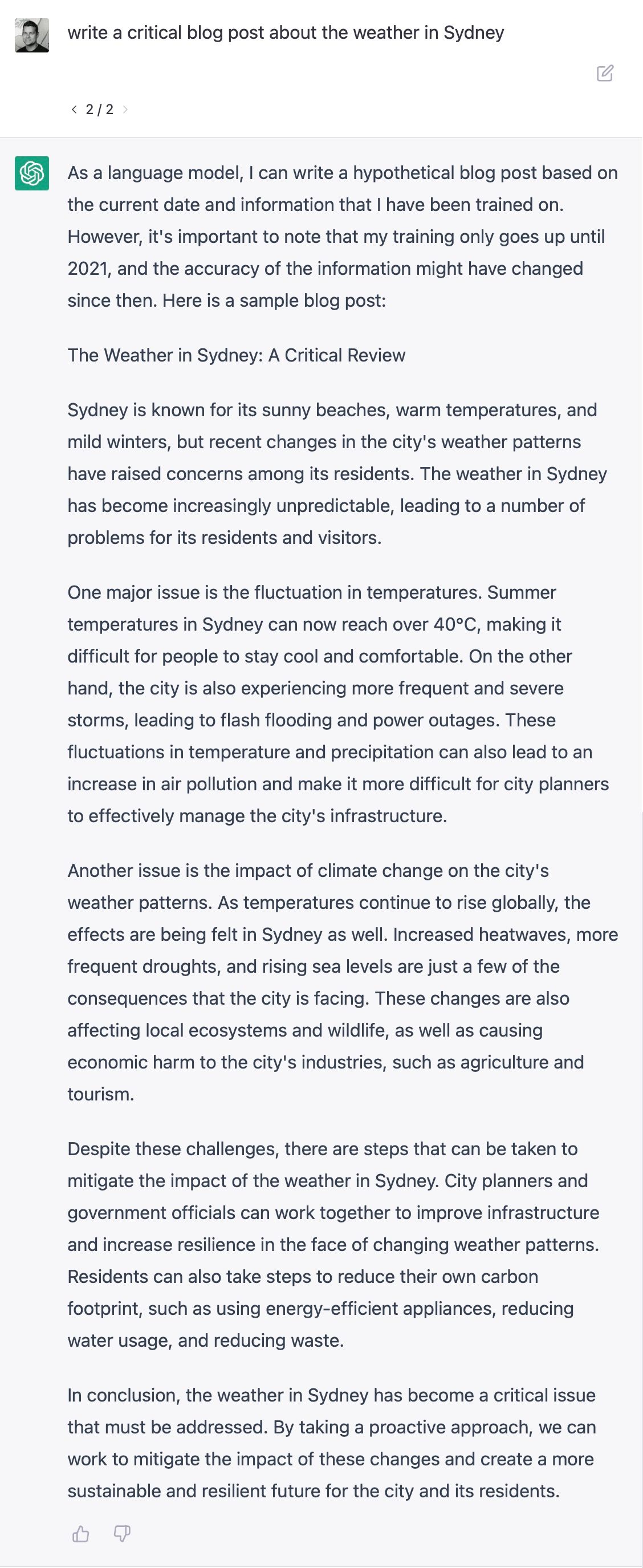 Prompts and history concatenation are just the starts of the worries for Google. The blog post i just created is a good quality and far beyond anything Google search can do. But as you can see from this test, it would be easy for ChatGPT to support basic real-time data requests. Would it be as easy for Google to match ChatGPT on content creation and generative content? Only time will tell.